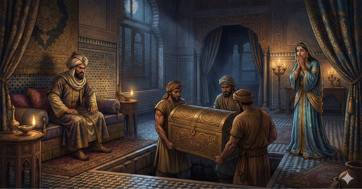 ציווה הח’ליף על משרתיו להוציא את הארגז מחדרה ולהביאו לחדר מושבו. שם פקד על המשרתים לחפור בור עמוק שהגיע עד למי התהום. הוא ציווה עליהם להכניס את הארגז לבור ולפני שכיסו אותו בעפר, פנה הח’ליף אל הארגז ואמר: “שמועה הגיעה לאוזנינו. אם נכון הדבר – אנו קוברים אותך ואת שמך לעד, ואם טעינו הרי שקברנו דבר פחות ערך – ארגז מעץ.”